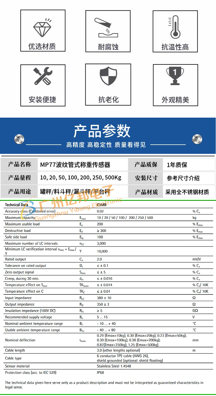 茵泰科MP77/250KgC3MR称重传感器 全不锈钢结构